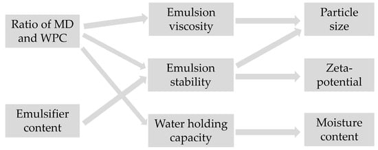 Compared with polysaccharide types, protein-based modified hydrophilic colloids have a higher emulsifying capacity (Such as whey protein concentrate, WPC) []. Increasing the content of WPC improves the emulsibility of the wall material, thus increasing the stability of the emulsion. The stability of lotion significantly affects its particle size and potential. WPC has a high water holding capacity, and it increases the moisture content, but using MD at the same time can reduce the moisture content []. Protein will increase the viscosity of a lotion due to its water-binding and water-retention properties []. Therefore, increasing the content of WPC will increase the viscosity of a lotion, leading to an increase in the particle size and water content (Figure 2). Maltodextrin polysaccharides establish hydrogen bonds and electrostatic forces with WPC, thereby improving the protective effect and stability of wall materials [].