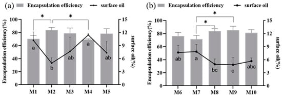 Efficiency of the microcapsules: (a) microcapsules with different ratios of IRN/MD/WPC. M1, M2, M3, M4, M5: microcapsules with the ratio of IRN, MD, and WPC of 1:3.2:0.8, 1:3:1, 1:2.4:1.6, 1:2:2, and 1:1.6:2.4, respectively. (b) Microcapsules with different emulsifier content. M6, M7, M8, M9, M10: microcapsules with emulsifier content of 2%, 2.5%, 3%, 3.5%, and 4%, respectively. Different letters indicate the significant difference among the samples at p < 0.05. * p < 0.05.