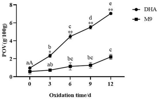 The POV of algal oil and the spray-dried DHA microcapsules. DHA: DHA-rich algal oil; M9: prepared DHA-rich algal oil powder with IRN/MD/WPC = 1:3:1 and 3.5% emulsifier (SSOS and MAC). Different lowercase letters indicate the significant difference among the DHA samples at p < 0.05. Different capital letters indicate the significant difference among the M9 samples at p < 0.05. * p < 0.05, and ** p < 0.01.