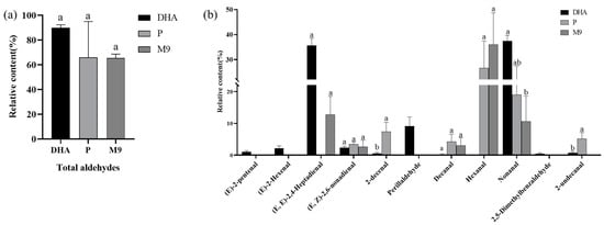 (a) The relative content per g of DHA of the total aldehydes of three samples; (b) the relative content per g of DHA of the single aldehydes of three samples. DHA: DHA-rich algal oil, 35% DHA; P: commercial DHA-rich algal oil powder, 10% DHA; M9: prepared DHA-rich algal oil powder with IRN/MD/WPC = 1:3:1 and 3.5% emulsifier (SSOS and MAC), 8.7% DHA. Different lowercase letters indicate significant difference at p < 0.05 among DHA groups.