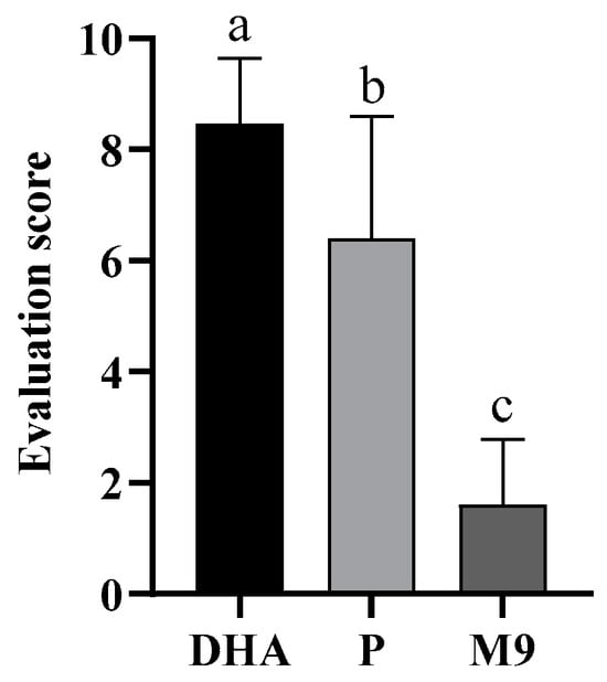 The odor sensory score of the samples. DHA: DHA-rich algal oil, 35% DHA; P: commercial DHA-rich algal oil powder, 10% DHA; M9: prepared DHA-rich algal oil powder with IRN/MD/WPC = 1:3:1 and 3.5% emulsifier (SSOS and MAC), 8.7% DHA. Different letters indicate significant difference at p < 0.05 among DHA groups.