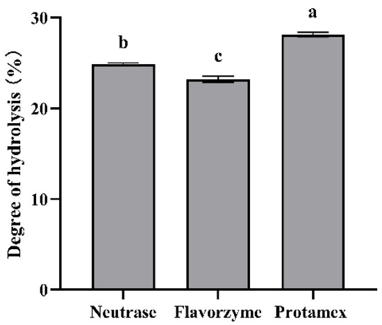 It can be known from Figure 1 that the hydrolysis degree of ESM by the Protamex is 28.13%, which is significantly higher than 24.89% of the Neutrase and 23.20% of the Flavorzyme (p < 0.05), suggesting that the degree of hydrolysis of skim milk by the Protamex is relatively high.
