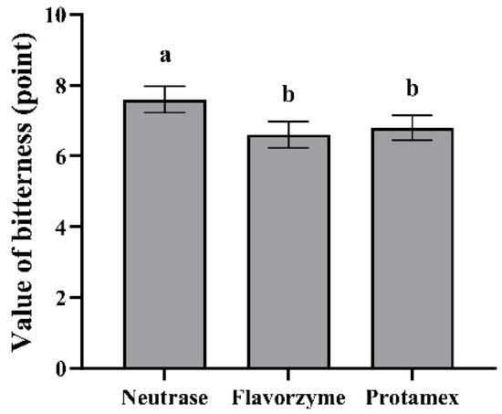 The bitter taste results in Figure 4 indicate that the bitter response value of the Protamex was 5.73, which was lower than 5.97 of the Flavorzyme and 6.23 of the Neutrase.