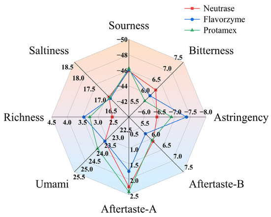 It can be seen from Figure 2 that the bitterness evaluation value of ESM by Neutrase was 7.60, which was significantly higher than 6.80 of the Protamex and 6.60 of the Flavorzyme (p < 0.05), suggesting that the bitterness of skim milk enzymatically hydrolyzed by Flavorzyme and Protamex was lower.