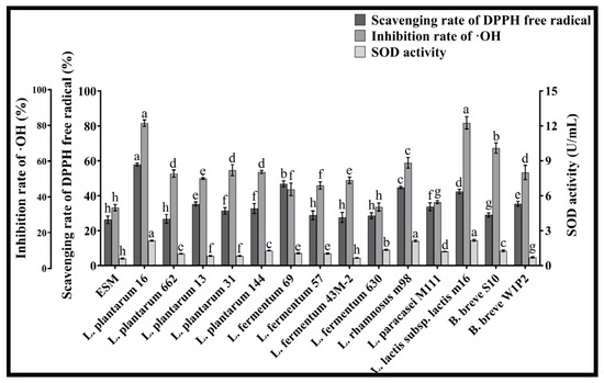 Figure 5 shows that the DPPH free radical scavenging rate of L. plantarum 16 was 57.91%, significantly higher than that of other strains (p < 0.05); the ·OH inhibition rate of L. plantarum 16 and L. lactis subsp. lactis m16 were significantly higher than those of other strains (p < 0.05), being 81.58 and 81.72%, respectively, and their SOD activity was also significantly higher than those of different strains (p < 0.05), being 14.27 and 14.48 U/mL, respectively. This indicates that L. plantarum 16 and L. lactis subsp. lactis m16 can better enhance the antioxidant ability of the ESM of the Protamex.