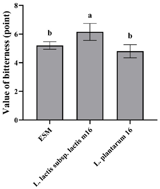 It can be known from Figure 6 that the bitterness evaluation value of ESM fermented by L. plantarum 16 was 4.80, which was significantly lower than 6.15 of L. lactis subsp. lactis m16 (p < 0.05). Although the bitterness evaluation value of ESM fermented by L. plantarum 16 was not significantly lower than that of ESM (p > 0.05), it still reduced the bitterness of ESM to a certain extent. On the contrary, the fermentation of L. lactis subsp. lactis m16 significantly increased the bitterness evaluation value of ESM (p < 0.05).