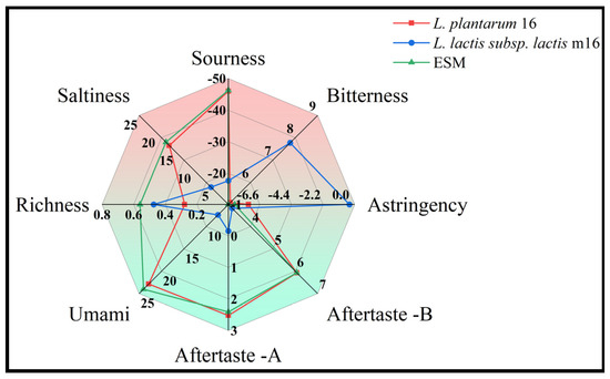 The bitterness response value of the ESM fermented by L. plantarum 16 was 5.10, which was lower than 7.77 of L. lactis subsp. lactis m16, and also significantly lower than 5.73 of the unfermented milk (Figure 7). Meanwhile, the astringency response value of the ESM fermented by L. lactis subsp. lactis m16 was significantly higher than that of L. plantarum 16 (p < 0.05) and the astringency had an essential influence on the taste of the ESM. This indicates that L. plantarum 16 can significantly improve the bitterness of the ESM while the fermentation of L. lactis subsp. lactis m16 enhances the bitterness of the ESM.