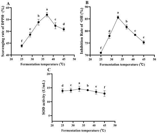 The antioxidant ability of ESM fermented by L. plantarum 16 at different fermentation temperatures. (A), DPPH free radical scavenging rate; (B), ·OH inhibition rate; (C), SOD activity. Different lowercase letters indicate significant differences (p < 0.05).