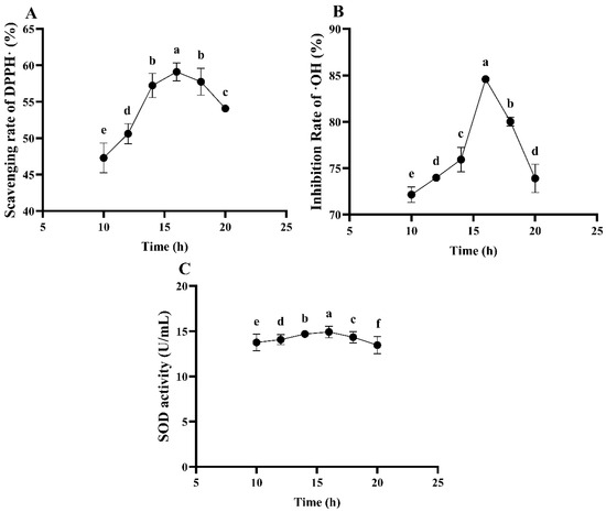 The antioxidant ability of ESM fermented by L. plantarum 16 at different fermentation times. (A), DPPH free radical scavenging rate; (B), ·OH inhibition rate; (C), SOD activity. Different lowercase letters indicate significant differences (p < 0.05).