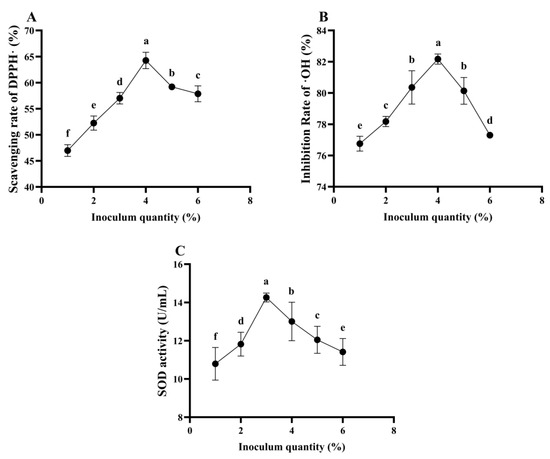 The antioxidant ability of ESM fermented by L. plantarum 16 under different inoculum quantity. (A), DPPH free radical scavenging rate; (B), ·OH inhibition rate; (C), SOD activity. Different lowercase letters indicate significant differences (p < 0.05).