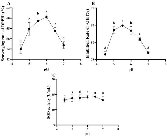 The antioxidant ability of L. plantarum 16-fermented ESM under different enzyme release pH conditions. (A), DPPH free radical scavenging rate; (B), ·OH inhibition rate; (C), SOD activity. Different lowercase letters indicate significant differences (p < 0.05).