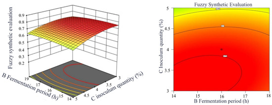 It can be known from Figure 9 that there is a noticeable slope change between the fermentation time and the inoculum quantity and the contour shape is approximately elliptical. It reflects that the interaction between the two significantly influences the fuzzy comprehensive evaluation value of L. plantarum 16 in the process of enzymatic hydrolysis and the defatting of milk (pAB < 0.05).