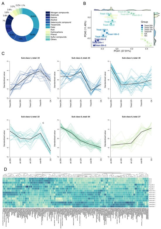 (A) Classification of volatile metabolites from PAMJ; (B) partial least squares analysis of volatile metabolite variations during lactic fermentation; (C) k-means plot of differential metabolites throughout lactic fermentation; (D) clustered heat map of volatile metabolites during lactic fermentation.