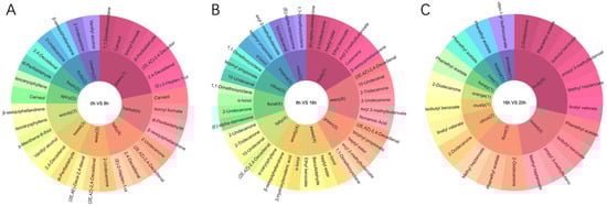 Flavor wheels of differentially accumulated metabolites: (A) flavor wheel of differentially accumulated metabolites in the pre-fermentation stage (0–8 h); (B) flavor wheel of differentially accumulated metabolites in the mid-fermentation stage (8–16 h); (C) flavor wheel of differentially accumulated metabolites in the late fermentation stage (16–20 h). Inner circles, different stages of fermentation; middle circles, associated odor descriptions; outer circles, names of differential metabolites with associated flavors.