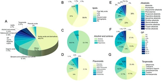 (A) Pie chart illustrating the primary classification of non-volatile compounds identified by UHPLC-MS/MS; (B–G) pie chart depicting the secondary classification within the first classification.
