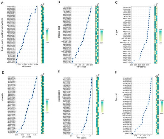 UHPLC-MS/MS to obtain non-volatile compounds differing significantly in PAMJ: (A) Heatmap of the top 40 amino acid and peptide compounds with significant differences + VIP; (B) Heatmap of the top 40 sugar compounds with significant differences + VIP; (C) Heatmap of the top 40 organic acid compounds with significant differences + VIP; Heatmap of the top 40 alkaloids with significant differences + VIP; (D) Heatmap of the top 40 phenolic acids with significant differences + VIP; (E) Heatmap of the top 40 phenolic acids with significant differences + VIP; (F) Heatmaps of the top 40 alkaloids with significant differences + VIP. Flavonoids with significant differences.
