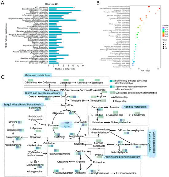 (A) KEGG topological analysis; (B) KEGG metabolite statistics; (C) KEGG-based pathway module associations of principal differential metabolites of PAMJ flavors; red and green substances represent differential metabolites within the metabolic pathway, blue substances denote metabolites identified in the metabolic pathway with insignificant alterations pre- and post-fermentation, while black substances signify intermediate metabolites in the metabolic pathway.