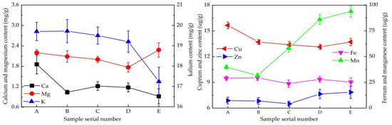 The samples were ashed in a KSL-1400X-A1 muffle furnace (Kuncheng Scientific Instrument Co., Ltd., Shanghai, China). The trace elements were subsequently detected with a Z-2310 atomic absorption spectrophotometer (Hitachi Ltd., Chiyoda-ku, Tokyo, Japan). The potassium content was measured with a flame photometer, whereas the manganese, magnesium, calcium, ferrum, cuprum and zinc contents were detected with an atomic absorption spectrophotometer. The detection parameters were as follows: the determination signal was BKG correction, the signal calculation was integrated, the gas pressure was 160 kPa, the auxiliary gas flow rate was 15.0 L/min, the burner height was 7.5 mm, the delay time was 5 s, and the calculation method was the standard curve method. The element detection wavelengths were as follows: calcium, 422.7 nm; magnesium, 285.2 nm; cuprum, 324.8 nm; zinc, 213.9 nm; manganese, 279.5 nm; and ferrum, 248.3 nm [14].