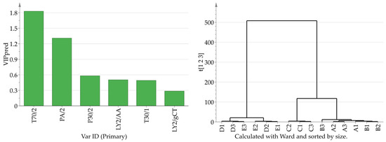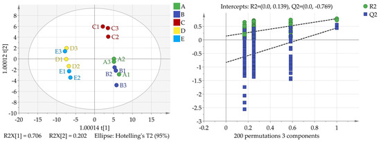 Electronic sensing was conducted using an electronic nose, which provided a comprehensive evaluation of the flavor profile of the coffee powder while minimizing artificial errors. The volatile composition was analyzed to identify differences in specific flavor components, allowing for mutual verification. The results from the electronic sensing are illustrated in Figure 3. The fit indices for the independent variable (R2x), the dependent variable (R2y), and the model prediction index (Q2) were 1.000, 0.626, and 0.187, respectively. Both the R2X and R2Y values exceeded 0.5, indicating a satisfactory fit of the predicted data and reasonable accuracy in data visualization [40].