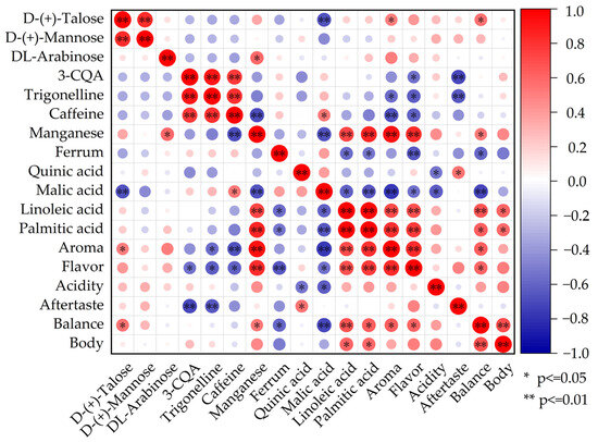 The quality of coffee cupping was closely related to the flavor precursor components and volatile components. The VIP was selected to identify the chemical composition and flavor precursor components that were significantly different between the different altitudes. The results of the VIP analysis are shown in the Supplementary Materials, and the correlation analysis with the significant components and cupping indicators are shown in Figure 5.