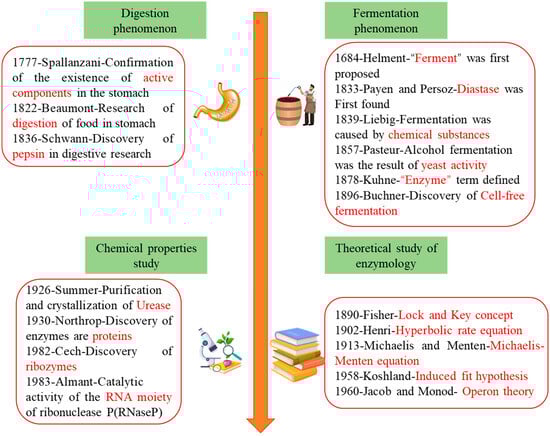 Enzymology began in the 19th century with the gradual understanding of the mechanisms of digestion and fermentation. Figure 1 illustrates the development of enzymology research. The use of natural enzymes for food processing and preservation dates back to ancient times, including bread-making in Egypt and fermentation practices across Eastern cultures. Over time, enzyme applications transitioned from traditional practices to systematic scientific research [1,2], revealing their chemical properties [3,4] and establishing the theoretical basis of enzyme engineering [5,6]. Enzyme engineering flourished in the late 20th century with advances in molecular biology and genetic engineering. However, large-scale production faces challenges as harsh solvent systems and mechanical stress often reduce enzymes’ thermal stability and catalytic activity, limiting industrial applications. Furthermore, as researchers deepen their understanding of enzyme structure and function, they increasingly recognize the importance of enzyme performance optimization in enhancing catalytic efficiency and meeting specific industrial demands. Consequently, various optimization techniques have emerged, including genetic engineering [7], chemical modification (such as covalent modification [8], cross-linking [9], and immobilization), directed evolution [10], natural enzyme screening and modification [11], and artificial enzyme development [12]. The exploration of these technologies collectively facilitates the enhancement of enzyme performance, addressing the industry’s need for innovation and quality and laying a solid foundation for the efficient and economical application of enzyme preparations in the food industry. Notably, directed evolution, enzyme immobilization, and new enzyme source exploration offer significant advantages in enzyme performance optimization. Proposed by Frances Arnold in the 1990s [13], directed evolution represents a breakthrough in enzyme engineering. By employing random mutagenesis and screening, this method generates highly adaptable and diverse enzyme variants, even without prior structural knowledge. Building on traditional random mutagenesis and screening, modern directed evolution integrates rational design and computational tools to leverage structural data and functional predictions, optimizing mutation strategies and improving screening efficiency. In contrast, genetic engineering typically requires a deep understanding of the structure and function of the enzyme. Compared with chemical modification methods such as covalent modification and cross-linking, enzyme immobilization significantly enhances the thermal stability and pH stability of enzymes by fixing them onto solid supports, allowing for their repeated use and simplifying the separation process. This enables immobilized enzymes to maintain catalytic activity for extended periods and operate under a wider range of conditions, further promoting their widespread use in large-scale industrial applications. Traditional enzyme sources face challenges like high production costs, complex extraction, and low stability, highlighting the need to explore new enzyme sources [14]. In this process, natural enzyme screening and modification, as well as artificial enzyme development, have become important research directions. These approaches not only expand the sources of enzymes but also enhance their functionality and adaptability. With advancements in these technologies, the application of enzyme preparations in the food industry is poised for a more efficient and economical transformation, driving ongoing innovation and development in the sector. This paper reviews recent advances in directed evolution, enzyme immobilization, novel enzyme sources, and the applications of enzyme preparations in the food industry.