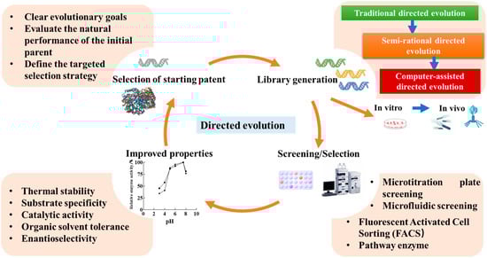 Directed evolution techniques can significantly improve the performance of enzymes used in the food industry, such as substrate specificity [16], enantioselectivity [17], thermal stability [18], and organic solvent resistance [19]. These improvements directly impact productivity, quality, and cost in the food industry. Directed evolution consists of three steps: (1) selecting a starting paternal parent, (2) creating a genetic library, and (3) screening and selection [20]. The preconditions for directed evolution include selecting a highly active enzyme as the starting point, serving as the “patent” in the evolutionary process, defining clear optimization goals, and designing appropriate mutagenesis strategies. Once the library is established, efficient screening identifies enzyme variants with desired properties (Figure 2). This section mainly introduces two steps of genetic library establishment and high-throughput screening, which contribute to the continued development of the food industry.