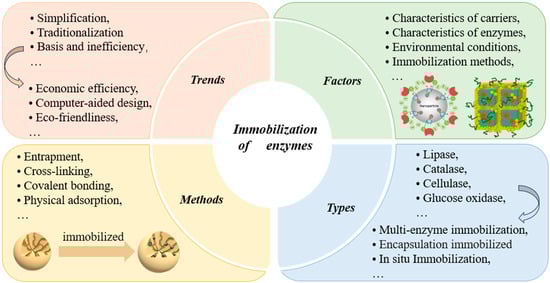 “Enzyme immobilization” refers to the process of localizing or confining free enzymes within a specific region, maintaining their catalytic activity, and allowing for repeated and continuous use [67]. The application scenarios, types, influencing factors, and development trends of immobilization are shown in Figure 4. As previously mentioned, enzyme engineering techniques, including rational design, directed evolution, and computer simulations, play a crucial role in optimizing enzyme performance and complementing enzyme immobilization technology, collectively advancing enzyme optimization and application. Enzyme engineering optimizes the structure and catalytic activity of enzymes by altering their amino acid sequences, and these optimized enzymes can be effectively immobilized onto carriers through immobilization techniques, significantly enhancing enzyme recovery, reusability, and applicability in industrial processes. Ultimately, this leads to more efficient biocatalysis and broader industrial applications. Currently, immobilization technology is advancing rapidly. It supports multifunctional immobilization and can be integrated with computational simulation techniques, allowing for precise control of immobilization conditions and reaction environments. The future is expected to be more intelligent, multifunctional, and sustainable, thus further enhancing the economic viability of enzyme immobilization technology in industry.