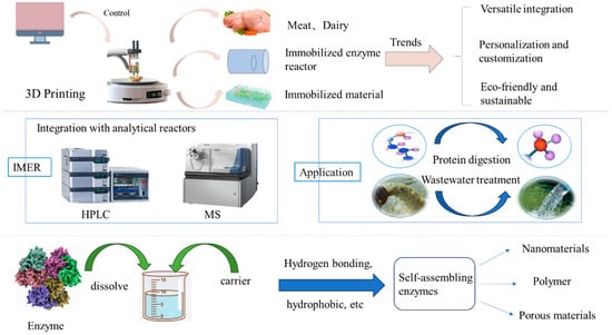 The Immobilized Enzyme Reactor (IMER) represents a system that retains enzymes on designated carriers within the reactor, effectively catalyzing reactions. This system can also be defined as a reusable flow apparatus. Based on structural and operational differences, IMERs can be categorized into microfluidic reactors [110], membrane reactors [111], fixed-bed reactors [112], and fluidized-bed reactors [113]. Immobilizing enzymes within reactors not only minimizes diffusion distances but also enhances mass transfer efficiency, boasting high flux and reduced analytical times [114]. Moreover, the flexible applicability of Immobilized Enzyme Reactors enables them to meet various food processing needs, making them essential tools for achieving efficient and sustainable food production. Currently, IMER technology finds applications in various fields, including proteomics [115], inhibitor studies [116], and industrial production [111]. However, its most common use remains in conjunction with analytical instruments such as high-performance liquid chromatography to facilitate the detection of fragments or product molecules. Despite its potential, the broader adoption of IMERs within analytical and industrial domains faces difficulties, including reproducibility in IMER production, robust integration into analytical platforms, and residual sample issues [114]. In the future, this technology is expected to evolve into more intelligent, multifunctional, and environmentally friendly systems, integrating nanomaterials to significantly enhance reaction efficiency and selectivity, thereby promoting sustainable development.
