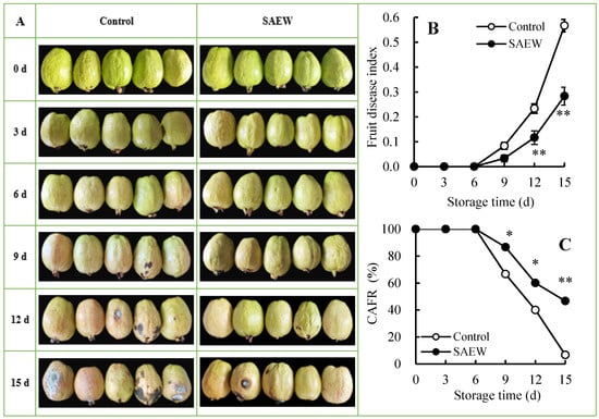 Influences of SAEW on fruit appearance (A), FDI (B), and CAFR (C) in postharvest guavas during 0–15 d of storage. * or ** represent significant (p < 0.05) or extremely significant (p < 0.01) differences between control guavas and SAEW-treated guavas on the same storage day, respectively.