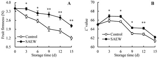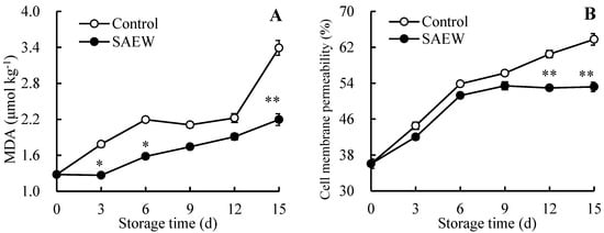 Influences of SAEW on the MDA (A) and CMP (B) levels in postharvest guavas during 0–15 d of storage. * or ** represent significant (p < 0.05) or extremely significant (p < 0.01) differences between control guavas and SAEW-treated guavas on the same storage day, respectively.