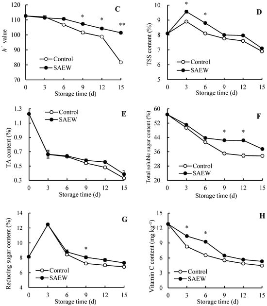 Influence of SAEW on the fruit firmness (A), L* (B), h° (C), TSS (D), TA (E), total soluble sugar (F), reducing sugar (G), and Vc (H) in postharvest guavas during 0–15 d of storage. * or ** represent significant (p < 0.05) or extremely significant (p < 0.01) differences between control guavas and SAEW-treated guavas on the same storage day, respectively.