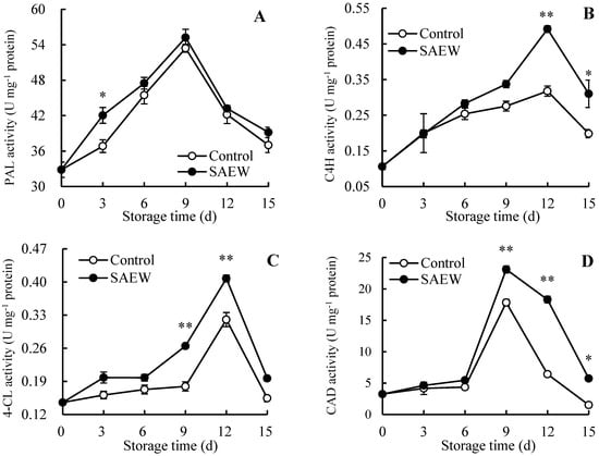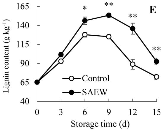 As illustrated in Figure 4C, control fruit exhibited a 0.13-fold increase in 4-CL activity on day 12 of storage compared to day 0, followed by a decrease from 12 to 15 d. In the SAEW-treated guavas, flesh 4-CL activity exhibited two increases (days 0–3 and 6–12) and two decreases (days 3–6 and 12–15) during the storage period. Compared to the control, the SAEW-treated guavas maintained higher 4-CL activity throughout the storage period.