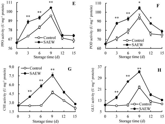 Influence of SAEW on PAL (A), C4H (B), 4-CL (C), CAD (D), PPO (E), POD (F), CHI (G), and GLU (H) activities in postharvest guavas during 0–15 d of storage. * or ** represent significant (p < 0.05) or extremely significant (p < 0.01) differences between control guavas and SAEW-treated guavas on same storage day, respectively.