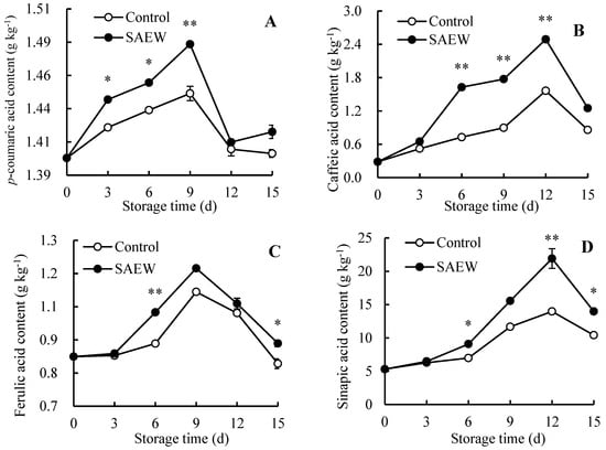 In the current data, the control guava fruit exhibited a 3.57% increment in the p-coumaric acid content within 0–9 d, followed by a descending trend for the remaining storage period (Figure 5A). The trend of SAEW treatment on p-coumaric acid content was similar to that of the control from 0 to 12 d of storage, showing an initial increase followed by a decrease. However, from 12 to 15 d, a transient increase was observed. In addition, SAEW treatment demonstrated a higher content of p-coumaric acid compared to control guavas during storage.