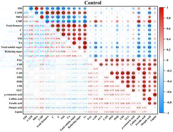 The contents of disease-resistance substances in the control guava fruit ascended first and then descended during the 0–15 d period (Figure 5). Correlation analysis in Figure 6 showed that p-coumaric acid (Figure 5A) in the control group was positively associated with PAL (Figure 4A) during storage, while caffeic acid (Figure 5B), ferulic acid (Figure 5C), and sinapic acid (Figure 5D) were all positively correlated with C4H (Figure 4B) and 4-CL (Figure 4C), indicating that phenolic acids involved in lignin synthesis were regulated by disease-resistance substance synthase. Specifically, in the early storage stage, the generation of disease-resistance substances in guavas was increased by the activated disease-resistance substance synthetase activities. However, during the later storage stage, the synthesis of disease-resistance substances correspondingly declined due to the descending disease-resistance substance synthetase activities. This led to weak disease resistance in guavas, which could be reflected in the increased FDI (Figure 1B) and decreased CAFR (Figure 1C).