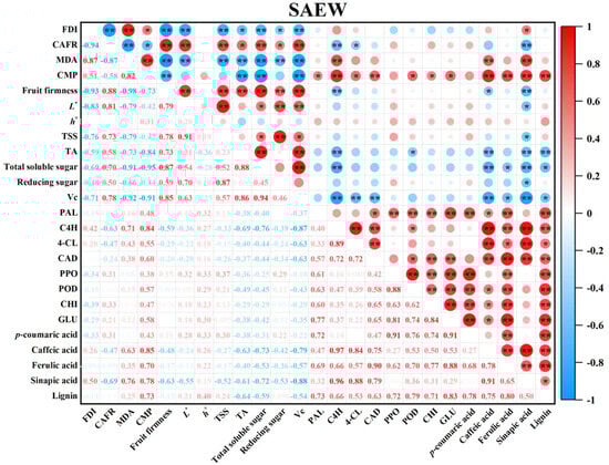 Heatmap of Pearson’s correlations on the obtained indicators in guavas. Positive correlations are presented in red and negative correlations are indicated in blue. The asterisk * or ** in the figure separately denoted the noticeable correlation (p < 0.05) or highly noticeable correlation (p < 0.01) between these measured indices.