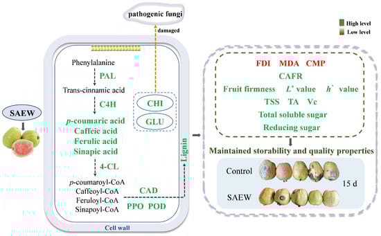 The possible mechanism regarding SAEW treatment enhancing the postharvest storability of guava fruit. The indicators in green indicate a higher level in SAEW treatment when compared to the control, and the indicators in red indicate the opposite.
