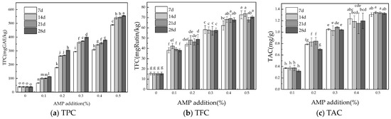 Changes in active ingredients of AMP honey during storage. Changes in AMP honey compared to original honey over 7, 14, 21, and 28 days regarding (a) TPC; (b) TFC; (c) TAC. GAE (gallic acid equivalent); TPC (total phenolic content); TFC (total flavonoid content); TAC (total anthocyanin content). The results are expressed as mean ± standard deviation (n = 3). Different lowercase letters indicate significant differences (p < 0.05).