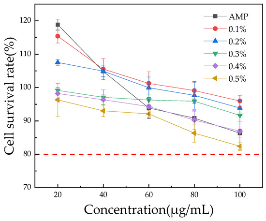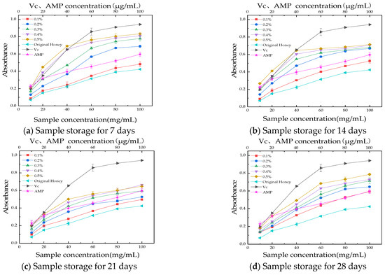 We weighed 50 g of honey and added AMP at concentrations of 0.1%, 0.2%, 0.3%, 0.4%, and 0.5% (w/w). The mixture was stirred using a magnetic stirrer and kept at room temperature, protected from light. The optimal storage time was determined by measuring the active ingredients and antioxidant activity at 7, 14, 21, and 28 days. The amount of AMP added was selected based on its effects on enzyme activity in honey, sensory evaluation, and cytotoxicity. The optimal level of AMP was determined by evaluating its effects on honey enzyme activity, sensory properties, and cytotoxicity. We assessed the potential inhibitory effects on enzyme activity, establishing a safe addition range. Sensory tests ensured that AMP did not alter honey’s flavor, vital for market acceptance. Cytotoxicity testing confirmed no harm to cells or human health. These factors guided the selection of the ideal AMP level to maximize antioxidant benefits while preserving honey quality and safety.
