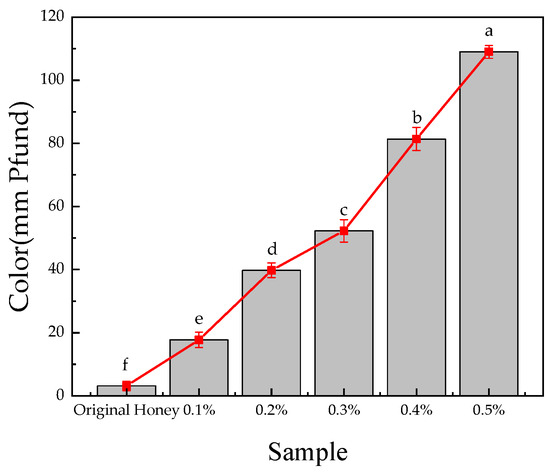 Effect of AMP addition on the color of honey. The results are expressed as mean ± standard deviation (n = 3). Different lowercase letters indicate significant differences (p < 0.05).