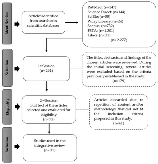 The search for available scientific articles was carried out on the following databases: PubMed, Scientific Electronic Library Online (Scielo), Science Direct, Scopus, Food Science and Technology Abstracts (FSTA), Latin American and Caribbean Health Science Literature, and Wiley Library. Appropriate terms were used for each database according to the Food Science Source Thesaurus, Medical Subject Headings (MeSH), Embase Subject Headings (EmTree), and Health Sciences Descriptors (DeCS), using a combination of keywords in English—“hybrid burger”, “plant-based burger”, “meat analog”, “meat-like burger”, “hamburger”, and “quality of burger”—and the Boolean operator AND.