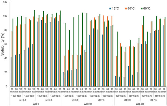 Solubility of FBPI dispersions reconstituted under various solution conditions (pH—6.8/7.5, water hardness—0, 200, or 400 ppm, shearing rate—1000 or 1500 rpm, time—30, 60, or 90 min) at 15, 40, or 65 °C.