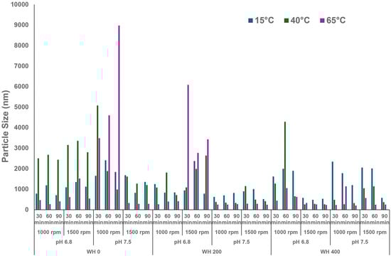 Particle size of FBPI dispersions reconstituted under various solution conditions (pH—6.8/7.5, water hardness—0, 200, or 400 ppm, shearing rate—1000 or 1500 rpm, time—30, 60, or 90 min) at 15, 40, or 65 °C.