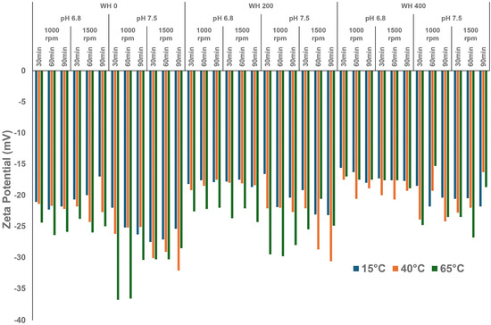 Zeta potential of FBPI dispersions reconstituted under various solution conditions (pH—6.8/7.5, water hardness—0, 200, or 400 ppm, shearing rate—1000 or 1500 rpm, time—30, 60, or 90 min) at 15, 40, or 65 °C.