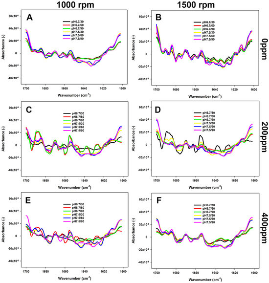 FTIR spectra (second derivative) of 5% FBPI dispersions held under different pH (6.8 or 7.5) and water hardness (0, 200, or 400 ppm) and sheared at 1000 rpm or 1500 rpm at 40 °C. (A,C,E) refer to dispersions prepared by stirring at 1000 rpm in water with a hardness of 0, 200 or 400 ppm; (B,D,F) to dispersions prepared by stirring at 1500 in a water with a hardness of 0, 200 or 400 ppm.
