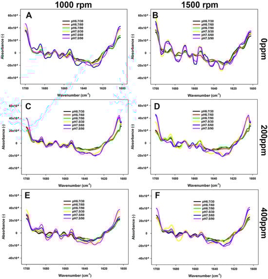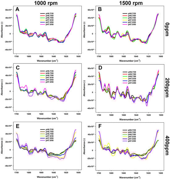 FTIR spectra (second derivative) of 5% FBPI dispersions held under different pH (6.8 or 7.5) and water hardness (0, 200, or 400 ppm) and sheared at 1000 rpm or 1500 rpm at 15 °C. (A,C,E) refer to dispersions prepared by stirring at 1000 rpm in water with a hardness of 0, 200 or 400 ppm; (B,D,F) refer to dispersions prepared by stirring at 1500 in a water with a hardness of 0, 200 or 400 ppm.