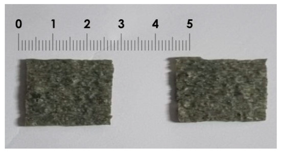 The processing of the green laver chips is shown in Figure 1. First, 20 g of green laver powder, 20 g of frozen surimi, and 60 g of flour, as the major ingredients, were homogenized at 10,000 rpm for 1 min in a homogenizer (T25-S1, IKA Labortechnik, Staufen, Germany). Distilled water (90 mL), in which sugar (12 g), table salt (1 g), roasted soybean powder (1.5 g), and a leavening agent (GDL: NaHCO₃ = 3 g: 2 g) were dissolved, along with 10 mL of RFS, was then added to the mixture and homogenized for 1 min to make the dough. The prepared green laver dough was transferred into a customized acrylic frame (150 mm width × 250 mm length × 15 mm thickness) and spread into a sheet using a rod (40 mm diameter × 385 mm length), then cut and molded into rectangular chips (25 mm width × 40 mm length). The molded chips were dried in an oven (OF-22; Jeio Tech, Daejeon, Republic of Korea) at 50 °C for about 2 h until the moisture content was approximately 13–14%. The moisture content of the green laver chips was determined during processing using a moisture analyzer (Ohaus MB 25, Pine Brook, NJ, USA). The dried green laver chips were heated in an air fryer (MC35A8599LE; Samsung Co, Port Klang, Malaysia) at 195 °C for 60 to 80 s to obtain the final product yielding 35.26% (Figure 2). The heating time of the air fryer and the optimum green laver-to-surimi ratio (%) used as the major ingredients were determined using response surface methodology (RSM).