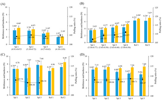 Preliminary experiments for the making of green laver chips. (A) Spl (sample) 1 consisted of green laver and surimi at a ratio of 10:10 g%; Spl 2 at 20:20 g%; Spl 3 at 30:30 g%; and Spl 4 at 40:40 g%. Rice flour ratio (g%) was set to 100-(green laver and surimi), and heating time was 90 s. (B) Spl 1, NaHCO3 2 g only, and Spl 2, 3, 4 were 2 g of NaHCO3 plus with GDL 1 g, 2 g, 3 g, respectively, under the condition of the ratio of green laver (20%): surimi (20%): rice flour (60%), heating time 90 s, and ref (reference, commercial snacks). (C) Spl 1, green laver and surimi 20:20 g%; Spl 2, 20:30 g%; Spl 3, 20:40 g%. Flour ratio (g%) was set to 100-(green laver and surimi), and heating time was 60 s, and ref (reference, commercial snacks). (D) Spl 1, heating time (HT) 60 s, Spl 2, 3, 4, 5 were 70 s, 80 s, 90 s, and 100 s of HT, respectively, under the condition of a composition ratio of green laver (20%), surimi (20%), and flour (60%). Brittleness (■), Hardness (■), puffing ratio (-●-), and sensory evaluation value (numbers in parentheses). a–c Means of the same superscript do not differ significantly, as determined by Duncan’s test (p < 0.05).