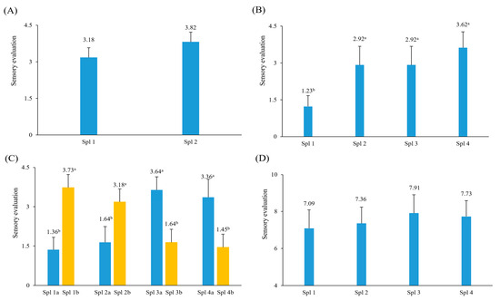 Next, we experimented by adding methionine, which is known to have a good effect in masking the characteristic odor of green laver and transforming it into a meat-like or savory odor [26,28] (Figure 4B). Compared to Spl 1 containing reaction precursors (proline 1.0 g, threonine 1.0 g, glycine 1.4 g, and glucose 2.0 g), Spl 2 (1.5 times the concentration of Spl 1), Spl 3 (concentration of Spl 1 + 0.05 g% methionine), and Spl 4 (concentration of Spl 2 + 0.05 g% methionine) were all significantly better (p < 0.05), and among them, Spl 4 was the best.