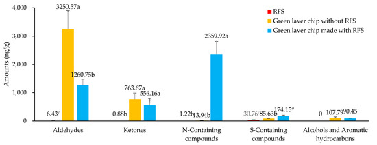 The quantities of categorized volatile compounds identified in the reaction flavor solution (RFS), green laver chip without RFS (GLC), and green laver chip containing RFS (GLCR). a–c Means of the same superscript do not differ significantly, as determined by Duncan’s test (p < 0.05).